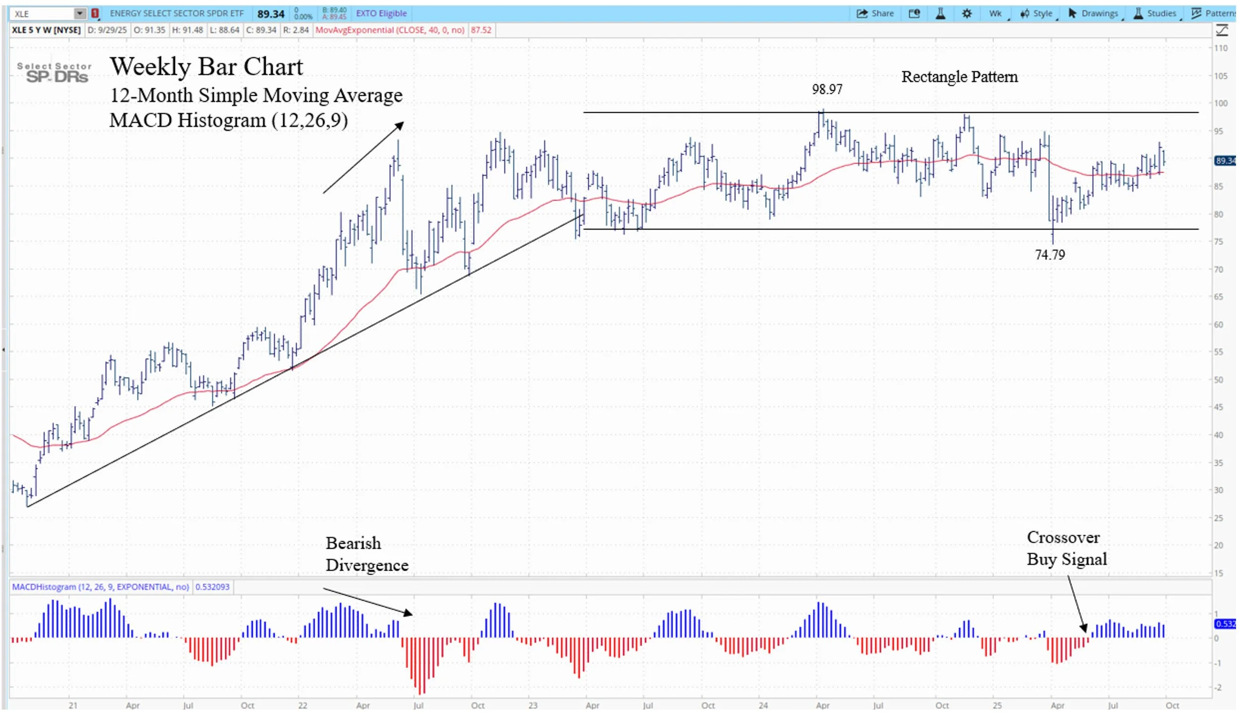The aforementioned rectangle pattern is traced out more clearly on weekly data, showing the sideways range XLE has been stuck in since April of 2023 between the 75 and 98 levels.