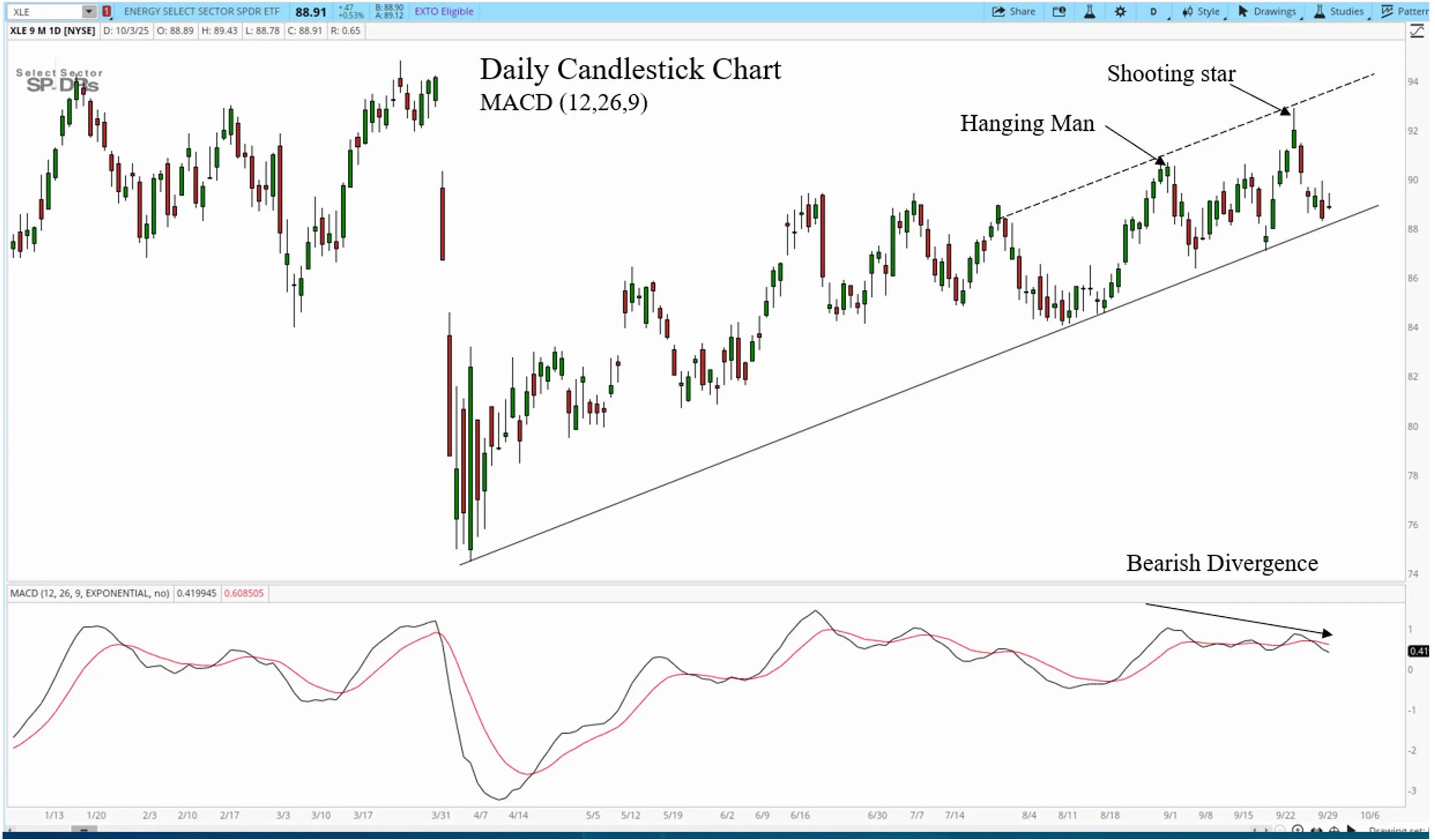 We saw over a 20% drop in XLE in a matter of three days last April with a pair of red Marubozu candles and large gaps. But the bullishness since the large drop has retraced almost all of the move down. This up leg following the April low is traced out more clearly on daily data.