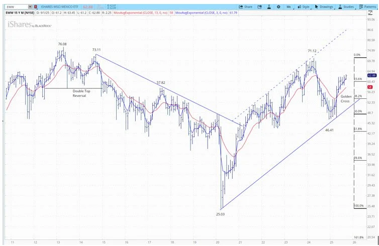A double-top reversal at the end of the 2014 started a five-year downtrend that bottomed in March of 2020 at 25.03 The last five years on the long-term monthly chart show an up channel with a still tentative support line at this stage.