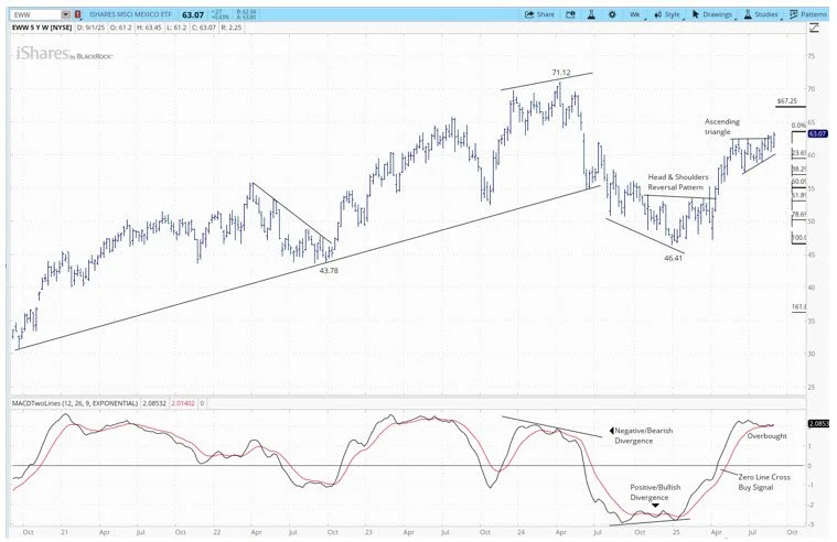 A negative divergence in the first half of 2024 ended in dynamic move down, ultimately breaking the trend line and continuing lower to 46.41 in December of last year. A head should and shoulders pattern triggered in April, coinciding with a MACD zero-line cross buy signal, that was able to reverse the medium-term downtrend, also confirmed with a bullish divergence in the MACD.