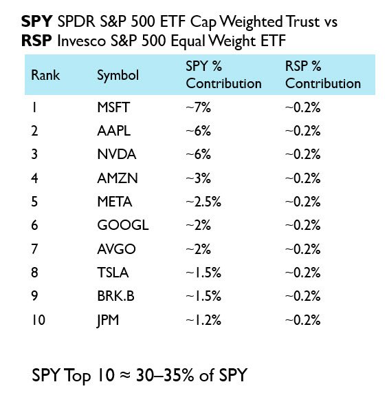 In an equal-weighted index like RSP, each stock contributes equally, providing a clearer view of how the average stock is behaving.