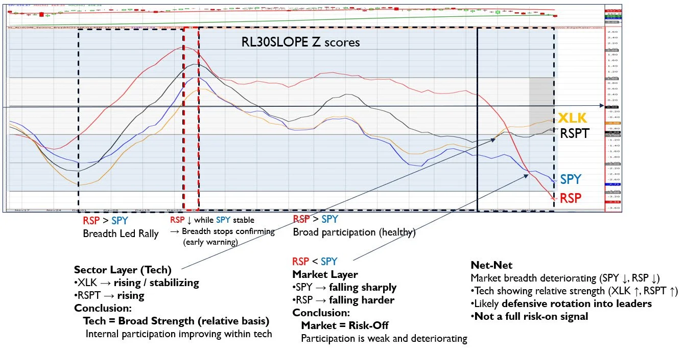 RL30SLOPE Z of XLK vs RSPT and SPY vs RSP in EDGERATER