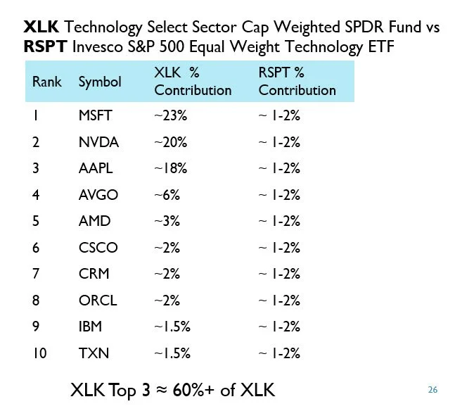 In XLK, a small number of large technology companies (such as Apple, Microsoft, and Nvidia) can account for a substantial portion of the ETF.